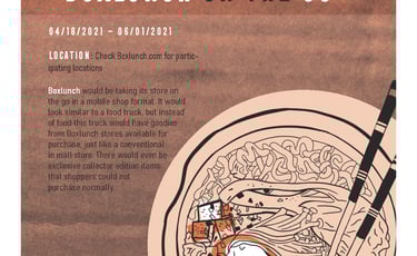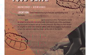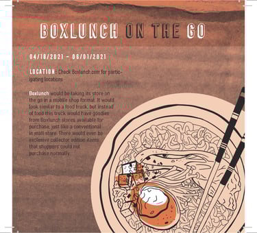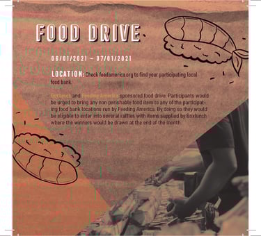 This project's goal was to create a self-mailer for a company. The company I chose is Boxlunch, a company that partners with Feeding America to donate 100 million meals to people in need. I chose to make it fold out in a plus to mimic how a box looks like when it is unfolded. This design also uses my own illustrations throughout.