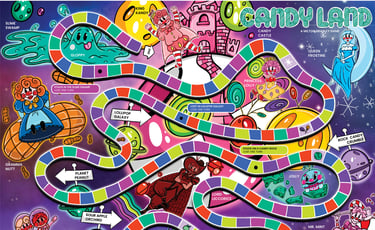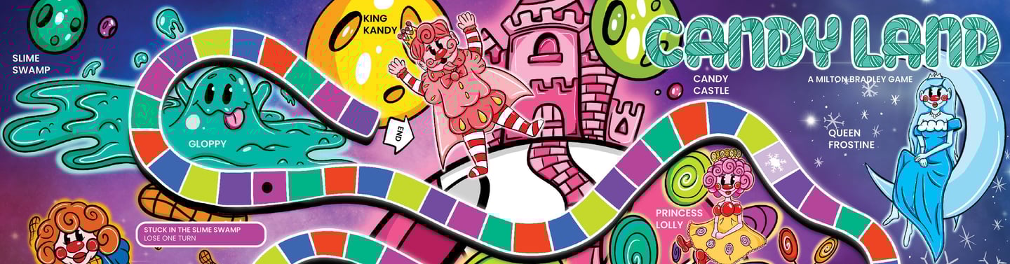I chose to redesign Candyland in an effort to take the current board game back to its roots with a fun twist. I find the current design too busy for kids and over-rendered. My version is still busy, to keep kids interested, but simple enough that I think it allows the art to speak for itself.